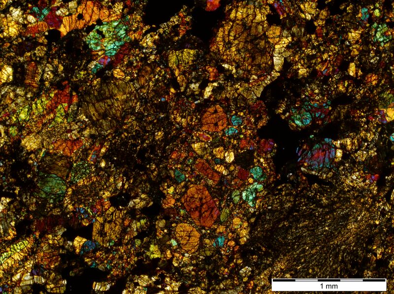 Силикатная часть состоит из оливина Fa24.41±1.09 (N=7), низкокальциевого пироксена Fs20.1±1.04Wo1.54±0.38 (N=9), плагиоклаза Ab78.5An14.8Or6.5 (N=8), хромистой шпинели Crt72Sp10.9Usp7.72 (N=2). Камасит содержит (мас. %, N=5): Fe 91.44, Ni –6.27, Co – 1.02. Тенит содержит 37.92 и 0.42 мас.% Ni and Co соответственно. Троилит близок к идеальной формуле FeS.