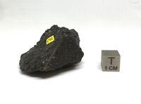 Коллекция Метеориты, №163. Углистый хондрит NWA 12590, CV3R. Размер фрагмента 4 х 3 х 2.5 см. Масса 44 грамма. Длина экспоната 4 см.