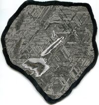 Коллекция Метеориты, №55. Пластина толщиной около 2мм и размером ~ 20 х 20 см (вес 888 грамм), выпиленная из октаэдрита Сеймчан. Сложена в основном камаситом (крупные ориентированно сросшиеся ламмели размером до 10 х 0,3 см) с вытянутыми включениями шрейберзита (до 5 х 0,4 см) . Вокруг кристаллов шрейберзита каймы камасита. Длина экспоната 20 см.
