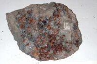 Коллекция Систематическая коллекция, №10763. Друза красно-оранжевых ромбододекаэдрического габитуса с гранями тетрагонтриоктаэдра кристаллов гессонита размером до 0,5см с кристаллами хлорита до 0,5см. и зональными - бесцветные основания и зеленоватые головки - кристаллами диопсида на родингите. Длина экспоната 20 см.Размер минерала 0.50 см.