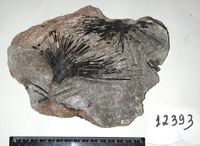 Коллекция Систематическая коллекция, №12393. Пучки изогнутых черных шестоватых кристаллов шерла в мелкочешуйчатом сланцеватом флогопите. Длина экспоната 19.0 см.