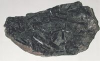 Коллекция Систематическая коллекция, №15469. Черные призматические кристаллы шерла размером до 12х1см в хлорите в прожилке в светлой породе. Штуф размером 40х18см. Длина экспоната 40 см.