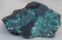 Коллекция Систематическая коллекция, №16649. Агрегаты ярко-зеленых лейст размером до 2см вдоль прожилка в хромите. Длина экспоната 25.0 см.