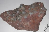 Коллекция Систематическая коллекция, №19131. Друза бледно-голубых кристаллов топаза призматического габитуса размером до 7х4см с отдельными кристаллами голубоватого флюорита размером до 2,5см. Образец сильно ожелезнен. Размер образца 34х20см. Длина экспоната 34.0 см.Размер минерала 7.00 см.