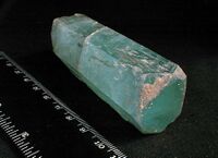Коллекция Систематическая коллекция, №24042. Голубой просвечивающий столбчатый призматический кристалл размером 8х3,5х3см. Помимо габитусных призмы и пинакоида присутствуют узкие грани дипирамид. Длина экспоната 8.0 см.Размер минерала 8.00 см.