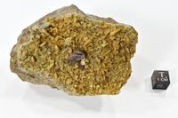 Коллекция Систематическая коллекция, №26315. Тонкопластинчатый коричневый (с окрашенным в черный цвет сектором в центре пластины) кристалл размером 1.2х0.5х0.05см на щетке кварца с мелкими кристаллами адуляра по трещине в мусковит-хлоритовом сланце. Длина экспоната 8.0 см.Размер минерала 1.20 см.