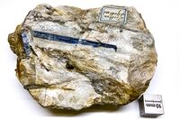 Коллекция Систематическая коллекция, №27686. Шестоватые кристаллы голубого кианита до ~5см в белом агрегате парагонита.