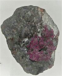 Коллекция Систематическая коллекция, №37129. Изометричное обособление густо-красного агрегата эвдиалита размером около 12см в нефелине и мелкозернистом апатите. С эгирином. Штуф размером более 30см. Длина экспоната 32.0 см.Размер минерала 12.00 см.