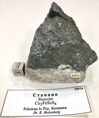 Коллекция Систематическая коллекция, №39974. Массивный черный агрегат станнина на светлом слоистом слюдите с кварцем. В станнине вкрапленность коричневого сфалерита. Размер образца 9 х 7 х 7 см. Длина экспоната 9.0 см.