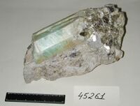 Коллекция Систематическая коллекция, №45261. Зеленоватый столбчатый кристалл размером 15х8см в кварце с мусковитом. Штуф 30х18см. Длина экспоната 30 см.Размер минерала 15.00 см.