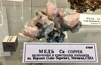 Найден: Keweenaw Point, Lake Superior, Мичиган, США.Минералы-спутники: Кальцит. Расположен на витрине exp13