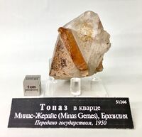 Коллекция Систематическая коллекция, №51266. Топаз желтый в кварце. L топаза - 4 см. L кварца - 6 см.