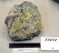Коллекция Систематическая коллекция, №51607. Прожилок в кварцевой породе, выполненный желтым радиально-лучистым карфолитом и сиреневым флюоритом. Длина экспоната 18.0 см.
