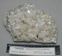 Коллекция Систематическая коллекция, №51791. Друза бесцветных слаборасщепленных кристаллов гейландита размером до 2см на плоской поверхности полости в эффузивной породе. Длина экспоната 20 см.Размер минерала 2.00 см.
