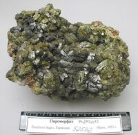 Коллекция Систематическая коллекция, №52592. Друза оливково-зеленых бочонковидных расщепленных кристаллов в полости в выщелоченной породе. Размер образца 17см. Длина экспоната 17.0 см.Размер минерала 3.00 см.
