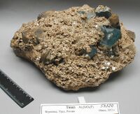 Коллекция Систематическая коллекция, №53120. Кристаллы голубого топаза пинакоидально-призматического габитуса с маленькими гранями дипирамиды размером до 6см с розетками мусковита и альбита, и кристаллами темного кварца. Размер образца 28х23см. Длина экспоната 28.0 см.Размер минерала 6.00 см.