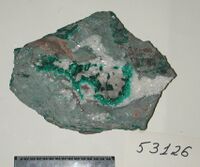 Коллекция Систематическая коллекция, №53126. Ярко-зеленые кристаллы размером до 1см в полости в кальцитовом обособлении в ороговикованной породе. Штуф размером 24х17см. Длина экспоната 24.0 см.