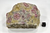 Коллекция Систематическая коллекция, №55839. Крупные изометричные зерна до 3см с бледным центром и розовой периферией в массивном кальцитовом скарне с желтым гроссуляром? Длина экспоната 10 см.Размер минерала 3.00 см.