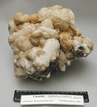 Коллекция Систематическая коллекция, №59023. Друза желтоватых расщепленных сноповидных кристаллов. Размер образца 21х19см. Длина экспоната 22.0 см.Размер минерала 7.00 см.