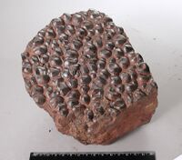 Коллекция Систематическая коллекция, №60929. Массивный агрегат скорлуповато-шестоватого строения, с одной стороны покрытый "буграми", напоминающими оплавленные кристаллы размером до 2см, а с противоположной такого-же размера и конфигурации "ямами". Размер образца 15х9х14см. Длина экспоната 17.0 см.