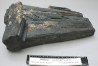 Коллекция Систематическая коллекция, №61509. Сростки черных призматических длинностолбчатых кристаллов размером до 20х2см в скарне. Длина экспоната 25.0 см.Размер минерала 20 см.