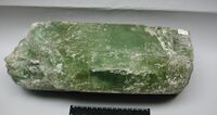 Коллекция Систематическая коллекция, №61704. Желтовато-зеленый призматического габитуса кристалл со скульптурами роста-растворения на гранях. Размер 37х15см. Длина экспоната 37.0 см.