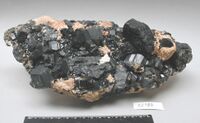 Коллекция Систематическая коллекция, №61784. Друза черных короткостолбчатых кристаллов размером до 5см на полевом шпате. Длина экспоната 20 см.Размер минерала 5.00 см.