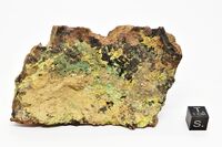 Коллекция Систематическая коллекция, №62337. По трещинам вмещающей преимущественно кварцевой породы ченые примазки урановой черни, щетки мелких кристаллов и примазки нескольких минералов: Зеленые толстотаблитчатые кристаллы торбернита размером до 1,5мм, и светло-желтые пластинчатые кристаллы на лицевой стороне образца частично покрыты светло-коричневым глиноподобным минералам. В отдельных участках порошковатый желтый минерал. На других сторонах образца развиты мелкокристаллические желтые корочки минерала похожего на ванденрисшеит (но вероятнее биллиетит). В отлельных участках на эти корочки нарастают светложелтые агрегаты игольчатых кристаллов (вероятно уранофан). Длина экспоната 10 см.