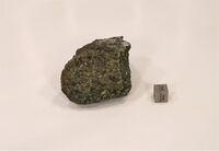 Фрагмент ксенолита крупнозернистых гранатовых перидотитов (гарцбургитов) из кимберлитов трубки Обнаженная, Якутия. Гарцбургиты состоят из светло-оливковых, прозрачных, трещиноватых зерен форстерита (до 1 см), темного серо-зеленого ортопироксена и отдельных зерен ярко-зеленого клинопироксена, розового граната и шпинели