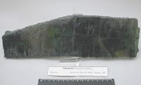Коллекция Систематическая коллекция, №64547. Темно-зеленая просвечивающая пластина размером 31х9см - выкол по спайности из кристалла вивианита. Длина экспоната 31.0 см.Размер минерала 31.00 см.