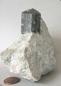 Коллекция Систематическая коллекция, №66727. Темно-зеленый (почти черный) хорошо образованный столбчатый кристалл размером 3,5х2,5х2,5см. Огранен призмами {100} и {110}, дипирамидой {111}. С ахтарагдитом в измененной скарновой породе. Длина экспоната 10 см.Размер минерала 3.50 см.