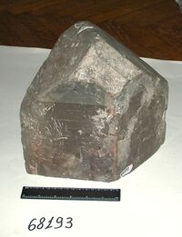 Коллекция Систематическая коллекция, №68193. Крупный ограненный призмами и менее развитыми гранями дипирамид и пинакоида голубовато-серый полупрозрачный столбчатый кристалл размером 25х25х15см. Длина экспоната 25.0 см.Размер минерала 25.00 см.