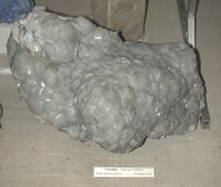 Коллекция Систематическая коллекция, №68760. Корка серых расщепленных кристаллов стеллерита на ороговикованной породе. Размер штуфа 48х28см. Длина экспоната 48.0 см.