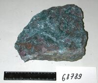 Коллекция Систематическая коллекция, №68789. Штуф размером 22х15см. Синие тонколучистые агрегаты кианита в наждаке. Длина экспоната 22.0 см.