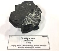 Коллекция Систематическая коллекция, №69040. Массивный темнозеленый серпентин с белым гидромагнезитом (?) по трещинам. С мелкими изометричными вкраплениями хромита (?). Уайрауита заметить не удалось. Он может присутствовать вместе с аваруитом в виде очень мелких зерен. DB