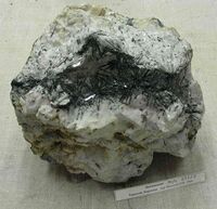 Коллекция Систематическая коллекция, №69124. Радиально-лучистые сростки антимонита размером диаметром до 7см в гигантозернистом кальците. Размер штуфа 26х20х15см. Длина экспоната 26.0 см.