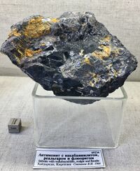 Найден: Хайдаркан, Киргизия.Минералы-спутники: Антимонит, Реальгар, Аурипигмент. Расположен на витрине exp41