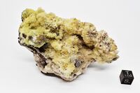 Коллекция Систематическая коллекция, №69242. Желтые желваковидные или почковидные скопления сростков до 0.5мм мелких кристаллов. Мелкие чешуйки или зерна зеленого цвета минерала. Все на пушистых щетках кальцита. Длина экспоната 11.0 см.