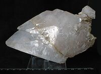Коллекция Систематическая коллекция, №69314. Бесцветный со слабым розоватым оттенком скаленоэдрический блочный кристалл размером 15х9см. Сдвойникован по (001). В основании менее крупный кристалл и пучки мелких веретенообразных кристаллов кальцита, вероятно, другой генерации или зарождения. Длина экспоната 15.0 см.Размер минерала 15.00 см.