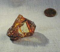 Коллекция Систематическая коллекция, №71396. Медово-желтый прозрачный с бурыми зонами выкол по спайности. Размер 3см. Длина экспоната 3.0 см.Размер минерала 3.00 см.