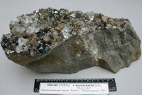 Коллекция Систематическая коллекция, №72036. Друза коричневых дипирамидальных кристаллов шеелита до 2см с бледно-зелеными гранными скелетными кубическими кристаллами флюорита до 2.5см, черными кристаллами касситерита до 1см и светлыми кристаллами арсенопирита до 1.5см на стенке трещины в ороговикованном сланце. Длина экспоната 27.0 см.Размер минерала 2.00 см.