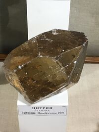 Коллекция Систематическая коллекция, №72092. Прозрачный кристалл цитрина размером 18х12х10см. На головке скол. Длина экспоната 18.0 см.Размер минерала 18.00 см.