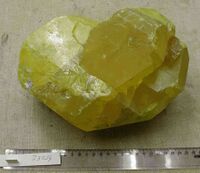 Коллекция Систематическая коллекция, №73014. Желтый полупрозрачный изометричный параллельный сросток размером 20х18х14см. Кристалл огранен дипирамидами и призмами. Длина экспоната 20 см.Размер минерала 20 см.