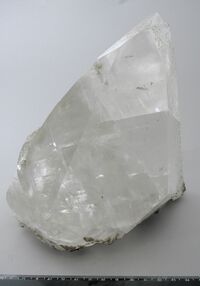 Коллекция Систематическая коллекция, №73725. Прозрачный бесцветный кристалл скаленоэдрического габитуса с гранями острого ромбоэдра. Размер образца 21х13х15см. Длина экспоната 21.0 см.