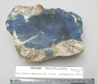 Коллекция Систематическая коллекция, №74341. Темно-синие крупнокристаллические агрегаты лазулита в кварце. Полированный образец. Размер 10х15см. Длина экспоната 15.0 см.