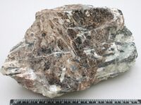 Коллекция Систематическая коллекция, №74461. Коричневые пластины ломоносовита размером до 10см. с эпитаксически нарастающим борнеманитом. В щелочном пегматите с микроклином эгирином арфведсонитом и эвдиалитом. Длина экспоната 17.0 см.Размер минерала 10 см.