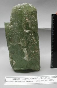 Коллекция Систематическая коллекция, №74814. Желтовато-зеленый кристалл призматического габитуса. Грани покрыты сложной скульптурой.Размер кристалла 18х9см. Длина экспоната 18.0 см.