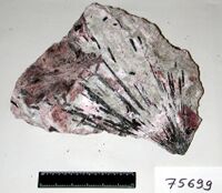 Коллекция Систематическая коллекция, №75699. Коричневая пластина в гидротермально измененном щелочном пегматите с микроклином и арфведсонитом. С крупными черными изометричными зернами стенструпина до 3см. Длина экспоната 35.0 см.Размер минерала 12.00 см.