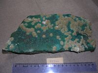 Коллекция Систематическая коллекция, №75961. Плоская щетка сферолитов хризоколлы, покрытая сферолитами кальцита и мелкими кристаллами кварца.