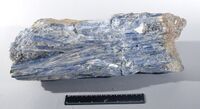 Коллекция Систематическая коллекция, №76272. Фрагмент кварцевой линзы с расположенными перпендикулярно контактам субпараллельными кристаллами ярко синего кианита длинной до 20см. Размер образца 38х14х14см. Длина экспоната 38.0 см.